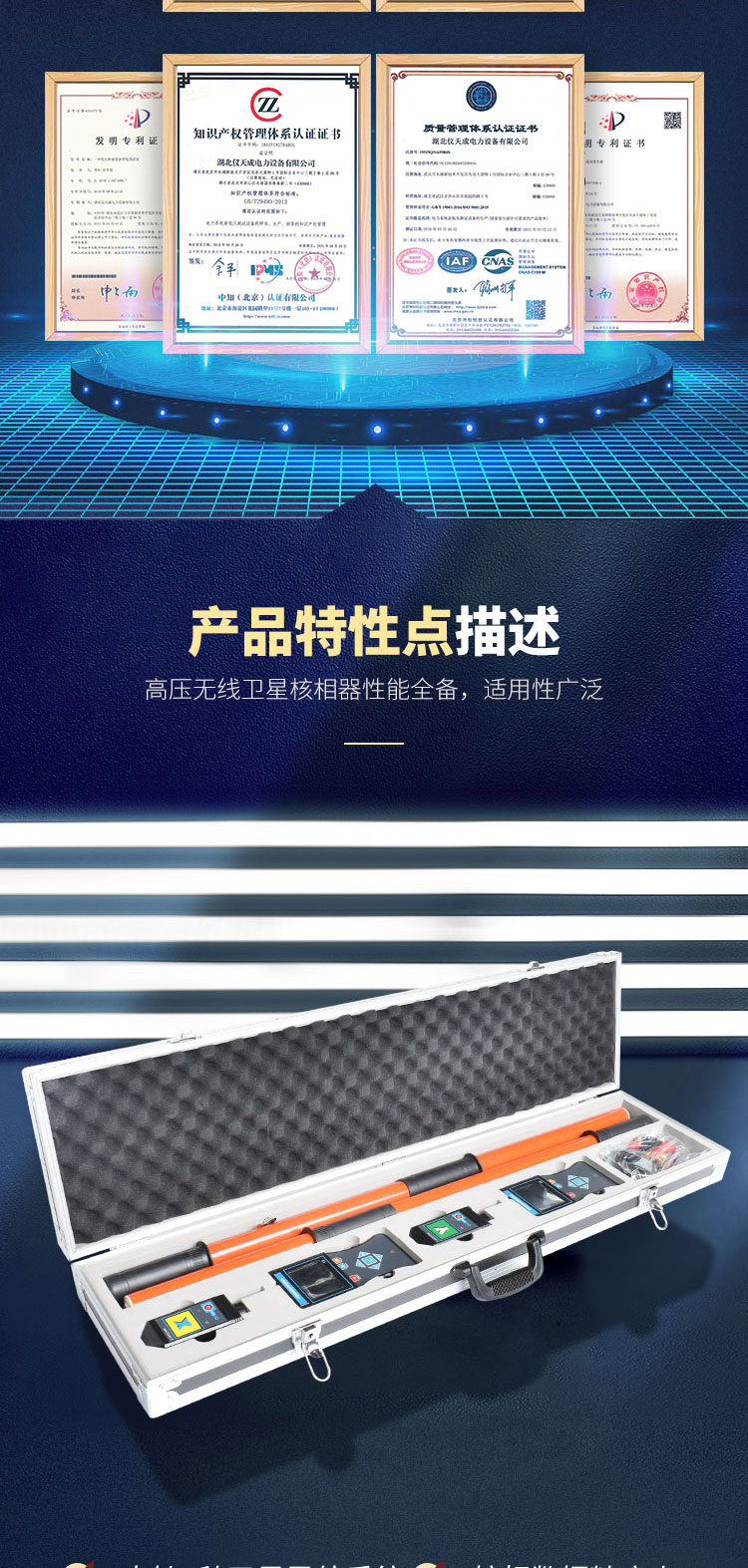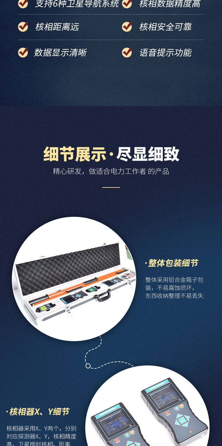 3、測試功能強,空曠地面普通核相距離可達160m,衛(wèi)星授時核相距離大于500km,能對10V~550kV的電壓線路全智能核相,也可用于高壓線路和完全密封的環(huán)網(wǎng)柜低壓感應點核相,