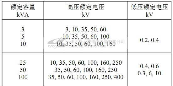 b)額定容量與高、低壓繞組電壓配合建議采用表1的推薦值,特殊要求時,由制造廠與用戶雙方協(xié)商確定。